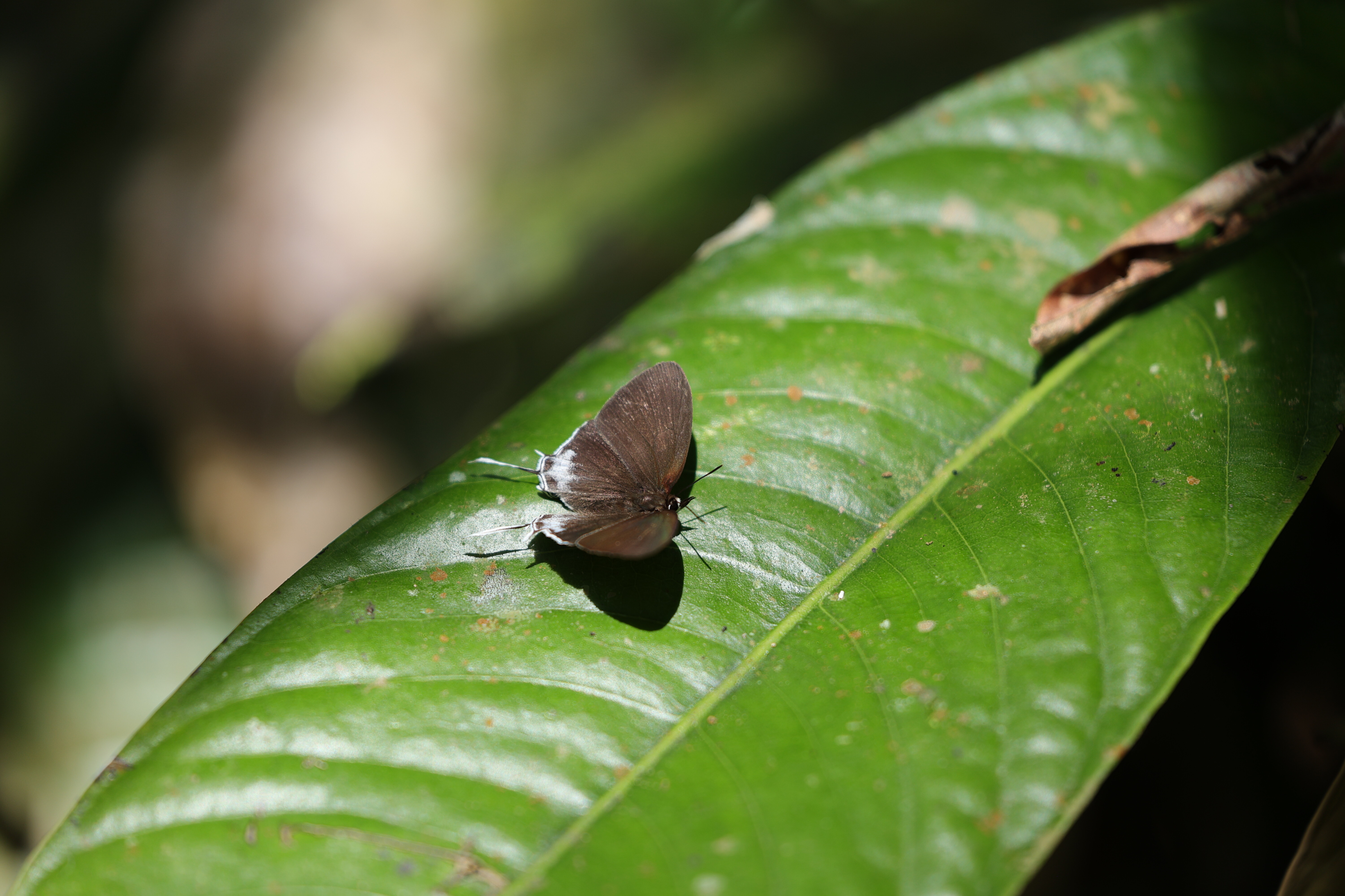 Moje skupienie zwróciło też uwagę pary spacerowiczów, którzy, widząc co robię, również zainteresowali się motylami i próbowali uchwycić je w kadrze. Był to jeden z 392 gatunków modraszków występujących na Borneo. Ale który? W tamtej chwili nie miałem pojęcia.