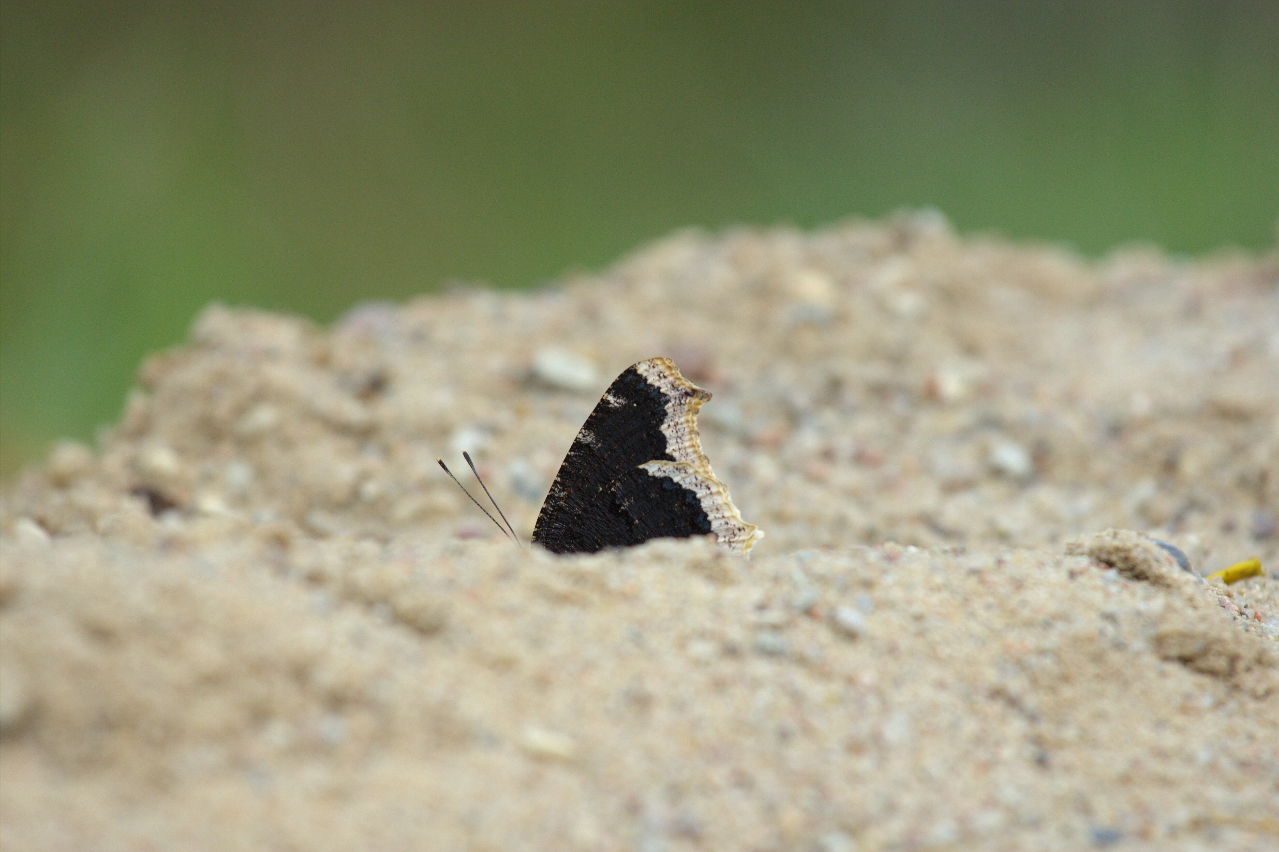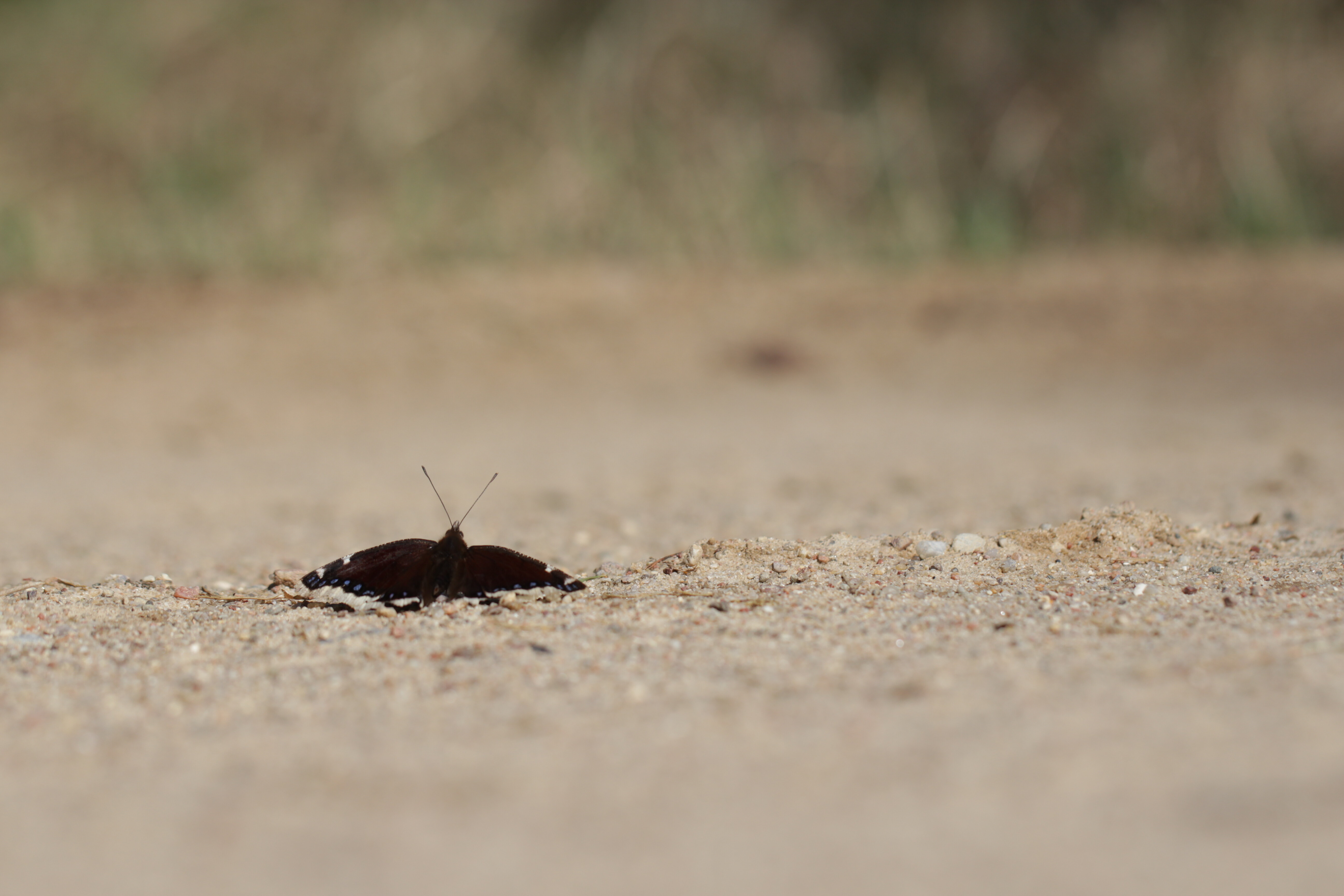 Droga nie jest bezpiecznym miejscem zarówno dla ludzi, jak i dla motyli. Zwłaszcza, że na tych szutrowych trasach kierowcy potrafią jechać zdecydowanie za szybko, pozostawiając za sobą tumany kurzu. Co nikomu nie sprzyja, zwłaszcza rowerzystom. Tak czy inaczej fotografowanie w takich warunkach powoduje dodatkowe komplikacje i niespodziewane zwroty akcji, o czym poniżej.