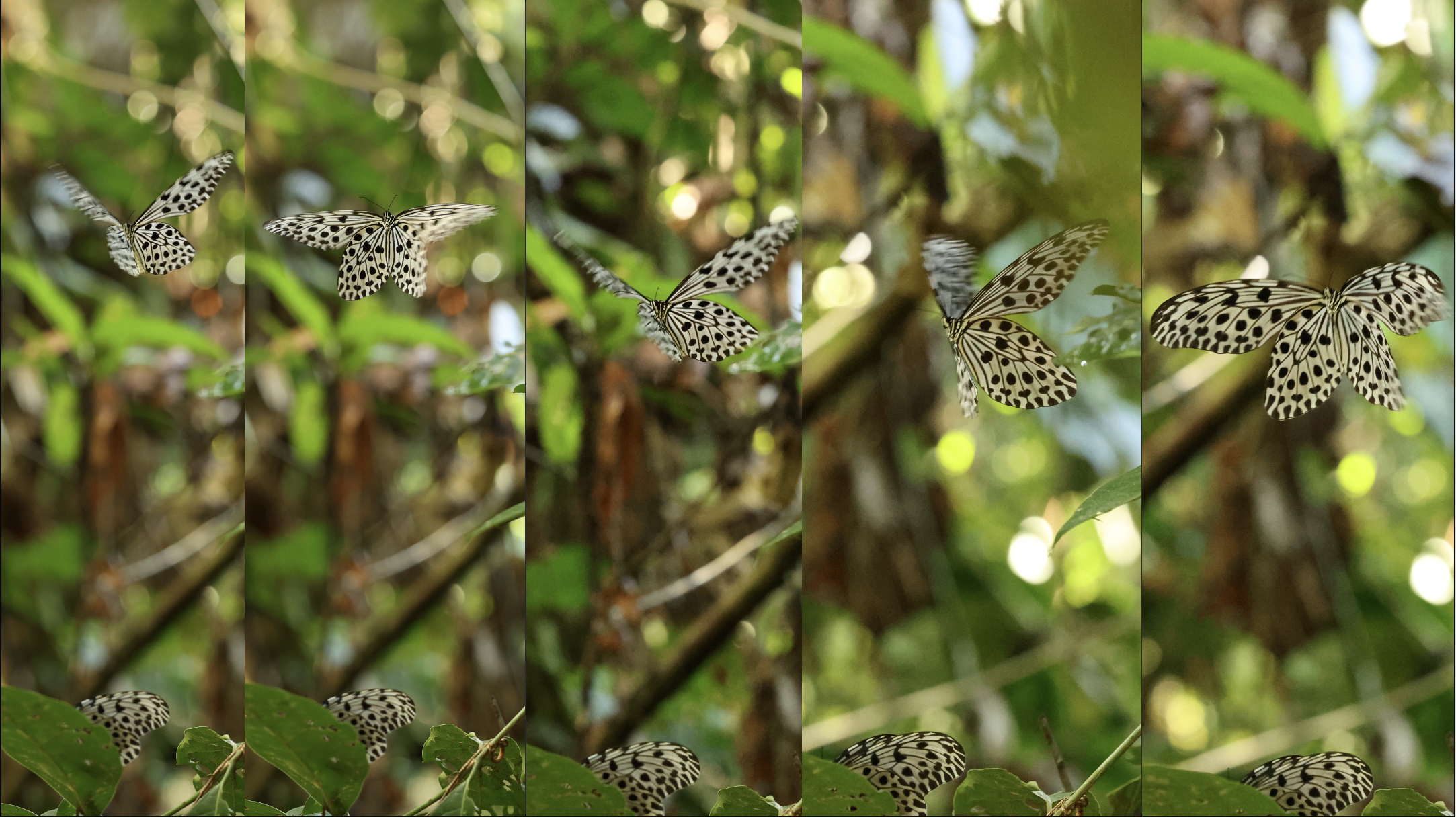 Od lewej: Graphium agamemnon agamemnon; Graphium doson evemonides; Papilio nephelus albolineatus; Polyura athamas; Udaiana cynis pryeri & Appias lyncida; Papilio nephelus albolineatus; Graphium doson evemonides; Graphium sarpedon luctatius. Fotografie duże poniżej: Papilio nephelus albolineatus; Graphium doson evemonides; Udaiana cynis pryeri & Appias lyncida.